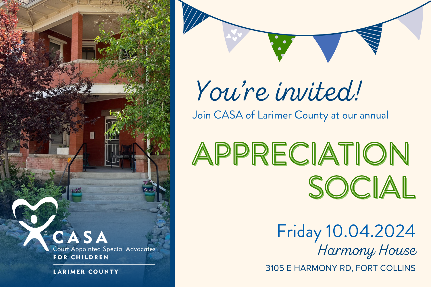 You’re invited to our 2024 Appreciation Social! Join us at the Harmony House on Friday, October 4th from 5pm – 7pm to celebrate CASA Volunteers, donors, partners, and supporters like you.